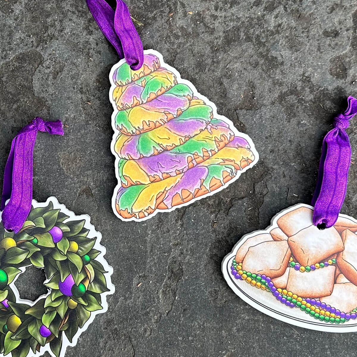 Get ready to unleash the festive spirit of Mardi Gras with this King Cake Tower Ornament! Featuring traditional purple, green, and gold colors, this unique hand drawn piece let's everyone know you're ready for carnival! Hang it with pride on your front door (or anywhere really) and laissez les bons temps rouler!